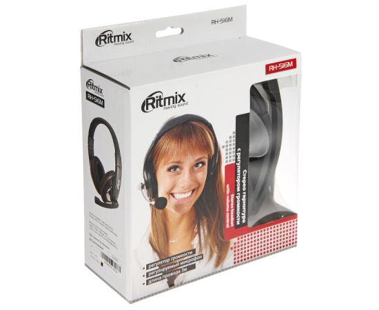 Гарнитура Ritmix RH-516М Black, мониторный тип O40 мм, микрофон на жёсткой ножке, регулируемое оголовье, регулятор громкости, 3.5 mm jack, кабель: 3 м, тканевая оплётка