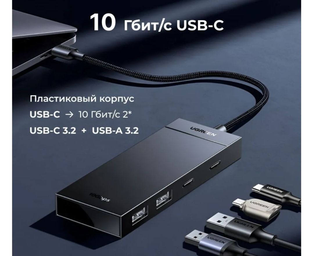 Хаб UGREEN CM806 (35583) USB-C To 2xUSB-A + 2xUSB-C HUB without PD. Цвет: черный
