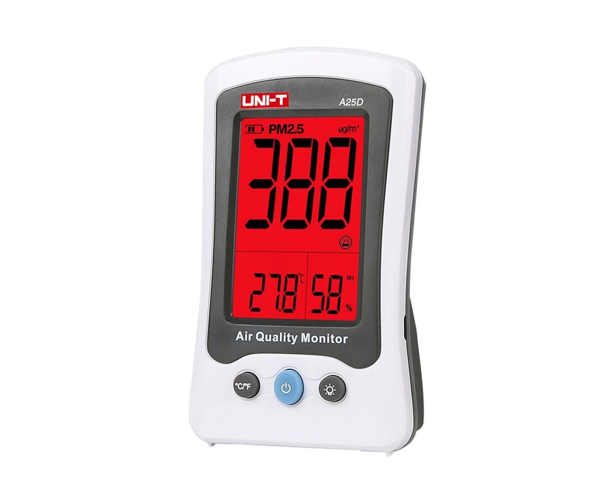Измеритель качества воздуха UNI-T A25D позволяет анализировать содержание в воздухе частиц размером 2.5 мкм и менее. Измерения должны производиться при температуре 18 … 28°C и относительной влажности 45 … 75%. Также позволяет измерить содержание в воздухе формальдегида, температуру и влажность. Есть цветовая сигнализация о превышении заданных параметров.