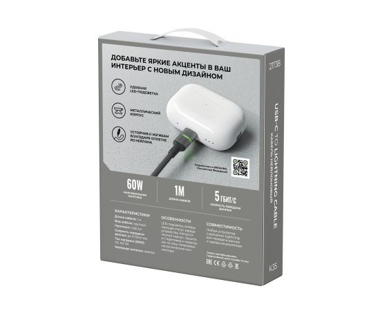 Кабель Breaking K35, USB-C - Lightning, 60W, можно использовать для подзарядки различных устройств с разъемом Lightning. Кабель пропускает ток в 3A., что предполагает возможность быстрой зарядки. Нейлоновая оплетка и круглая форма кабеля делают его более прочным. Кабель легко переносит многочисленные сгибания. Особенность кабеля - LED - подсветка, отображающая статус заряда устройства, металлический корпус, а так же никелевые металлические коннекторы.