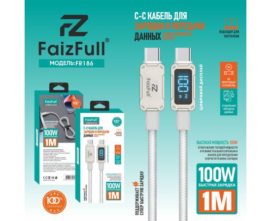 Кабель FaizFull FR186 Type-C to Type-C — это USB-кабель для зарядки и передачи данных с мощностью 100 Вт, длиной 1 м, в нейлоновой оплётке и с цифровым дисплеем. Он предназначен для быстрой зарядки ноутбуков, смартфонов, планшетов и других устройств с портом USB-C.