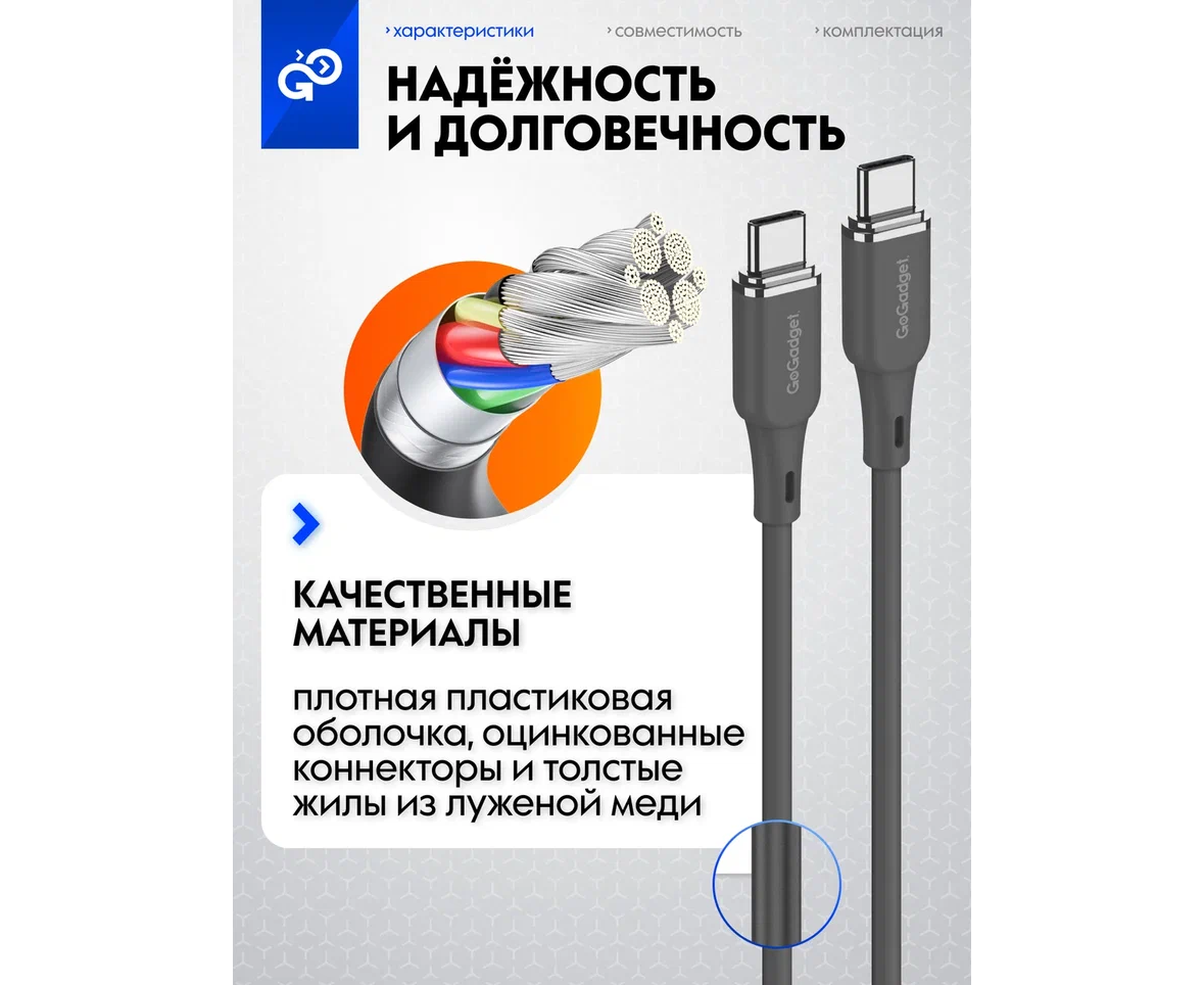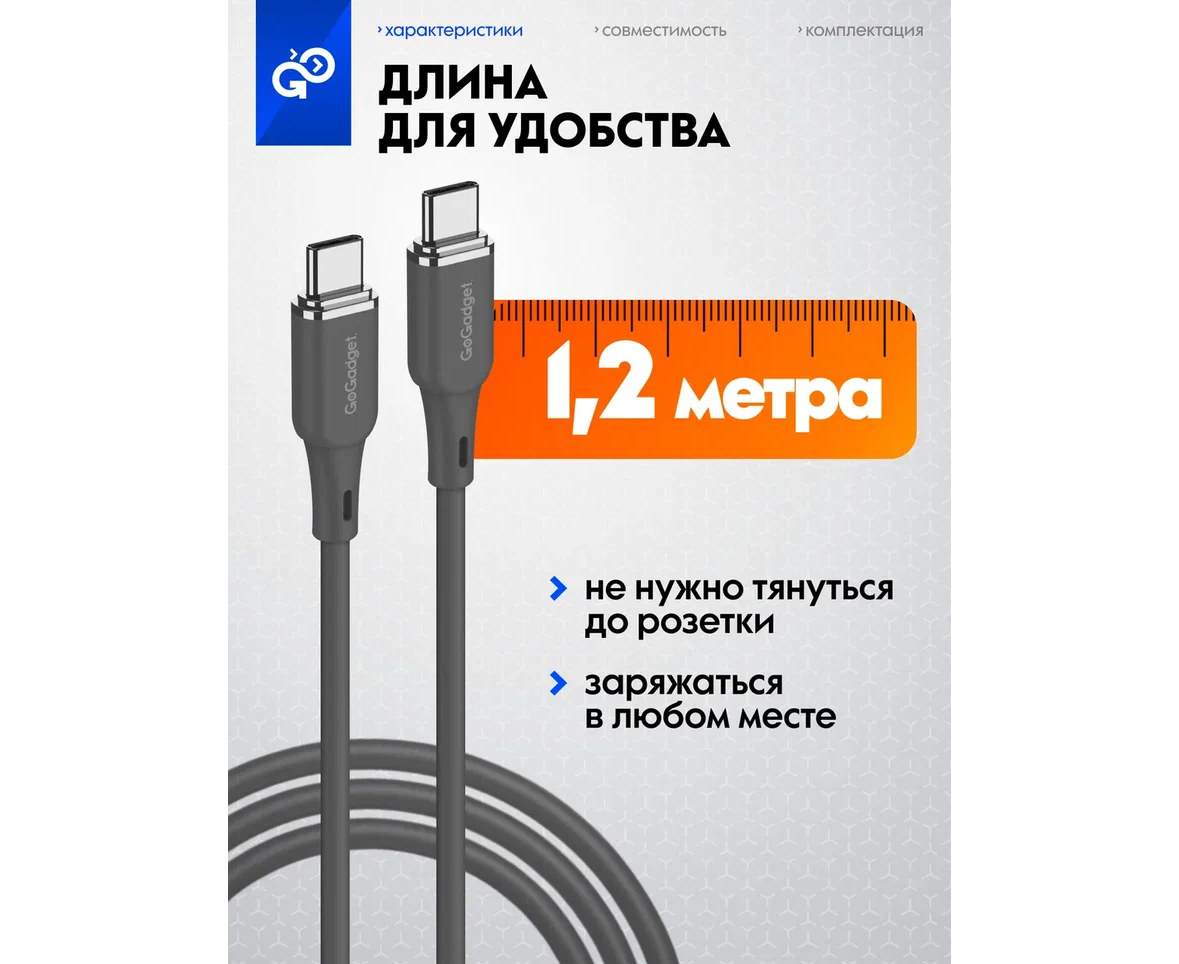 Кабель GoGadget USB-C/USB-С, 60Вт, 1,2 м Силикон, Темно-серый