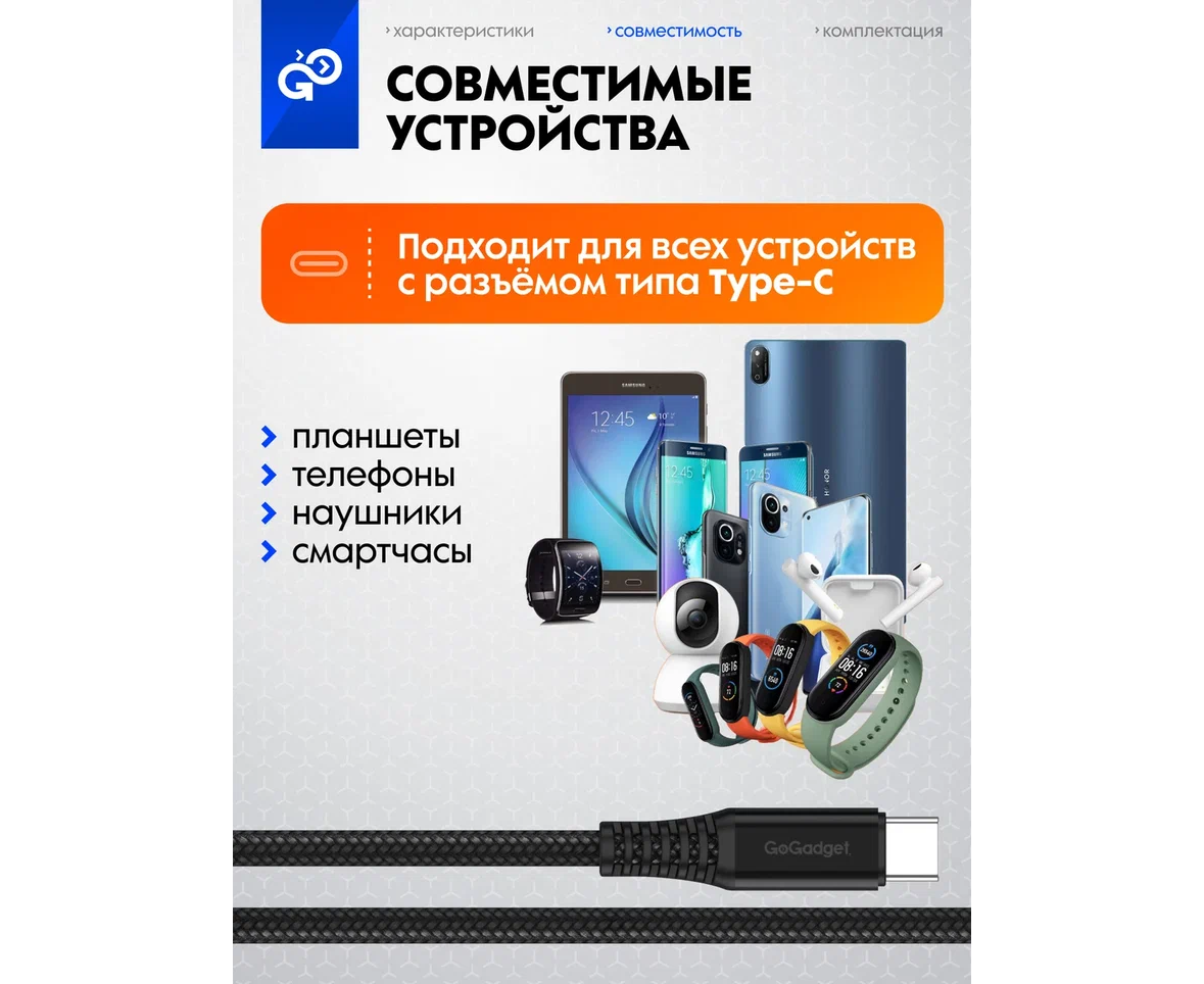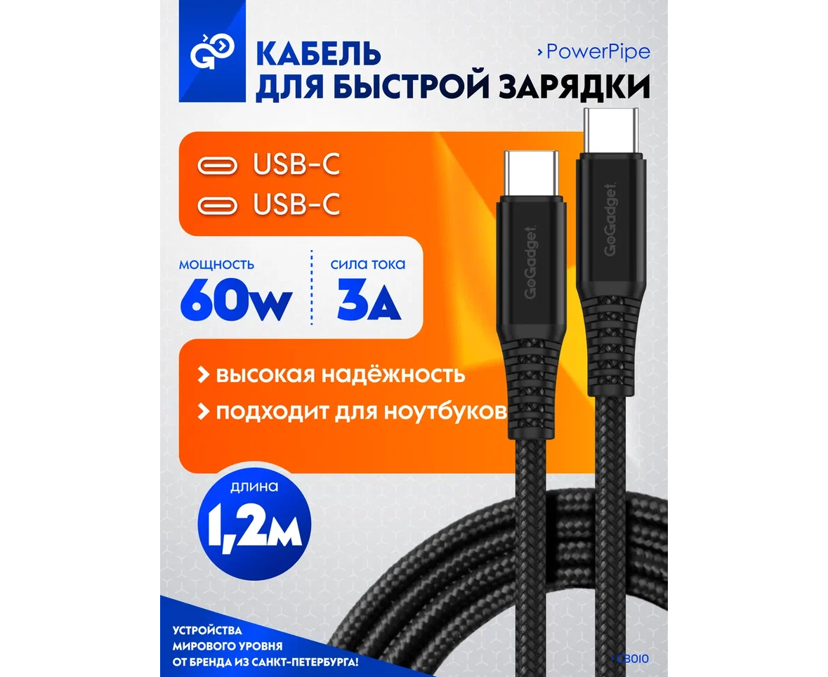 Кабель GoGadget USB-C/USB-С, до 60Вт, 3А, 1,2 м Нейлон, Черный