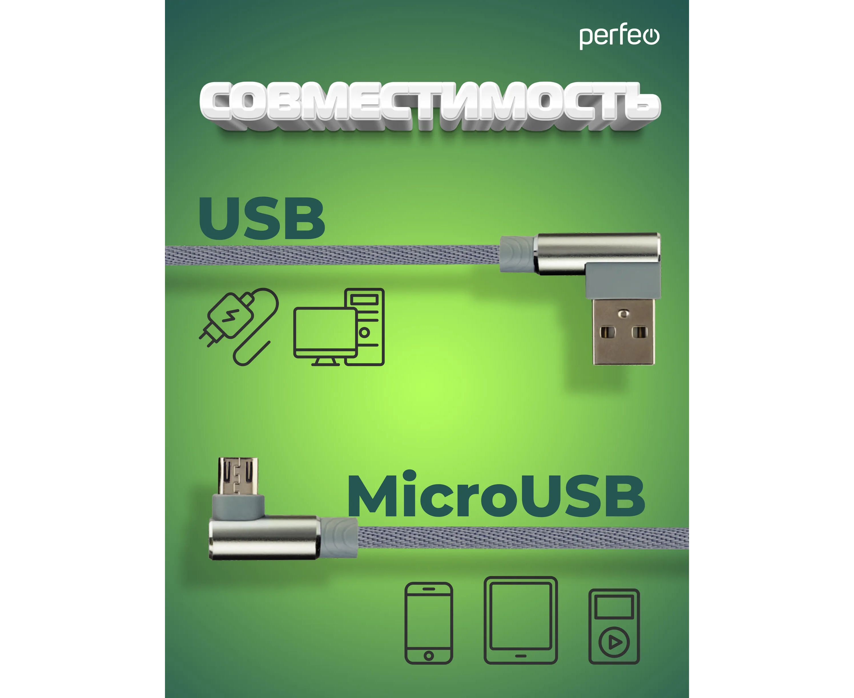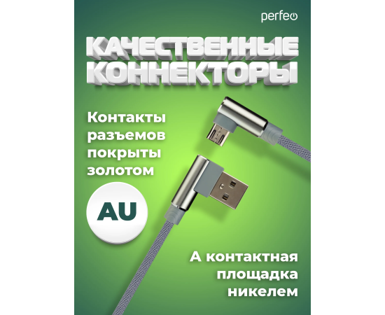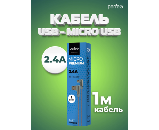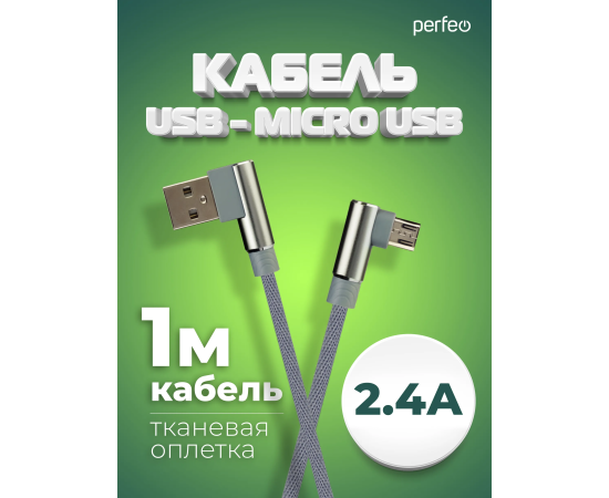 Кабель PERFEO USB A вилка - Micro USB вилка, 2.4A, угловой, серый, длина 1 м., Micro Premium (U4805)
