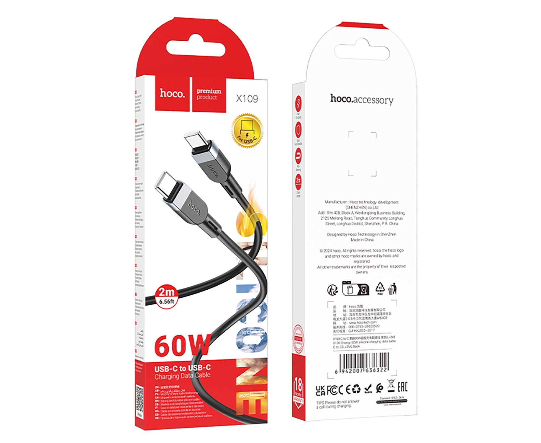 Кабель Type-C - Type-C Hoco X109 PD 60W 200см 3A (black) (236097)