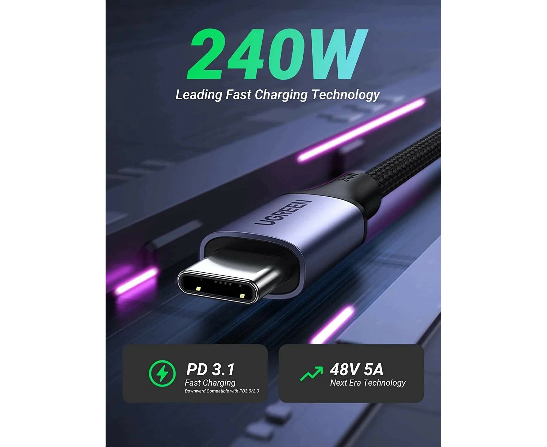 Кабель UGREEN US535 90440 USB-C to USB-C 240WPD Fast Charging Cable 2m Space Gray