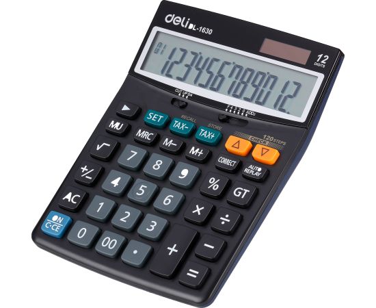 Калькулятор настольный, E1630, 188x140 мм, черныйБухгалтерский калькулятор Deli 1630 настольный в пластиковом корпусе с 12-разрядным ЖК-дисплеем. Имеет оптимальный набор вычислительных функций: основные математические операции, расчет процентов, извлечение квадратного корня, запоминание промежуточных результатов, вычисление налога и наценки. Позволяет корректировать введенное число. Удобная клавиатура снабжена кнопкой ввода двойного нуля. В калькуляторе имеется два источника питания. Размеры: 188х140х44 мм. В комплекте 1 батарейка LR44. 2VTB13