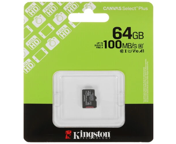 Карта памяти Kingston microSDXC 64 ГБ [SDCS3/64GBSP] пригодится владельцам смартфонов и других устройств. Модель соответствует классам скорости A1, UHS Class 1 и Video Class 10.