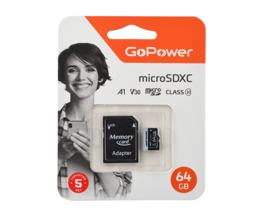 Карта памяти microSD GoPower 64GB Class10 70 МБ/сек V30 с адаптером