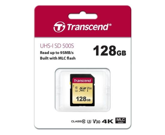 Карта памяти SDXC Transcend 500S, 128 Гб, UHS-I Class U3 V30, чтение: до 95Мб/с, запись: до 65Мб/с