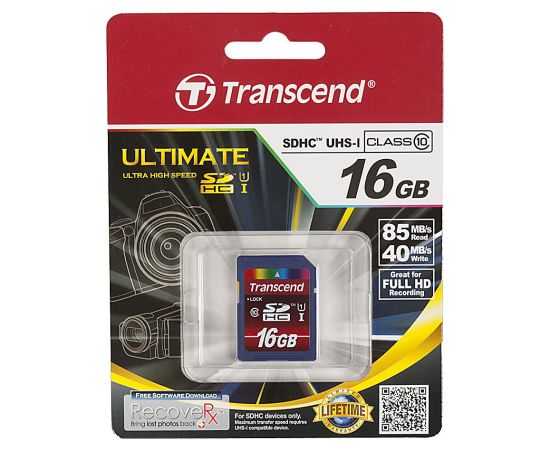 Карта памяти SDHC Transcend Ultimate, 16 Гб, UHS-I Class 10 U1, чтение: до 90Мб/с