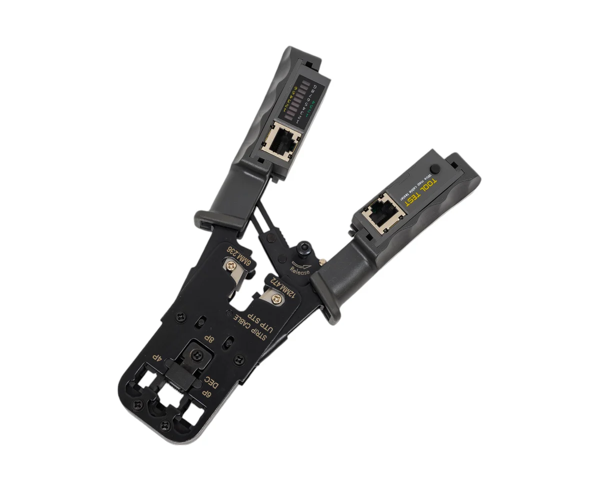 Устройство оснащено храповым механизмом и кабельным тестером. Кабельный тестер позволяет выявлять дефекты линий: перепутанные проводники, обрыв, замыкание.