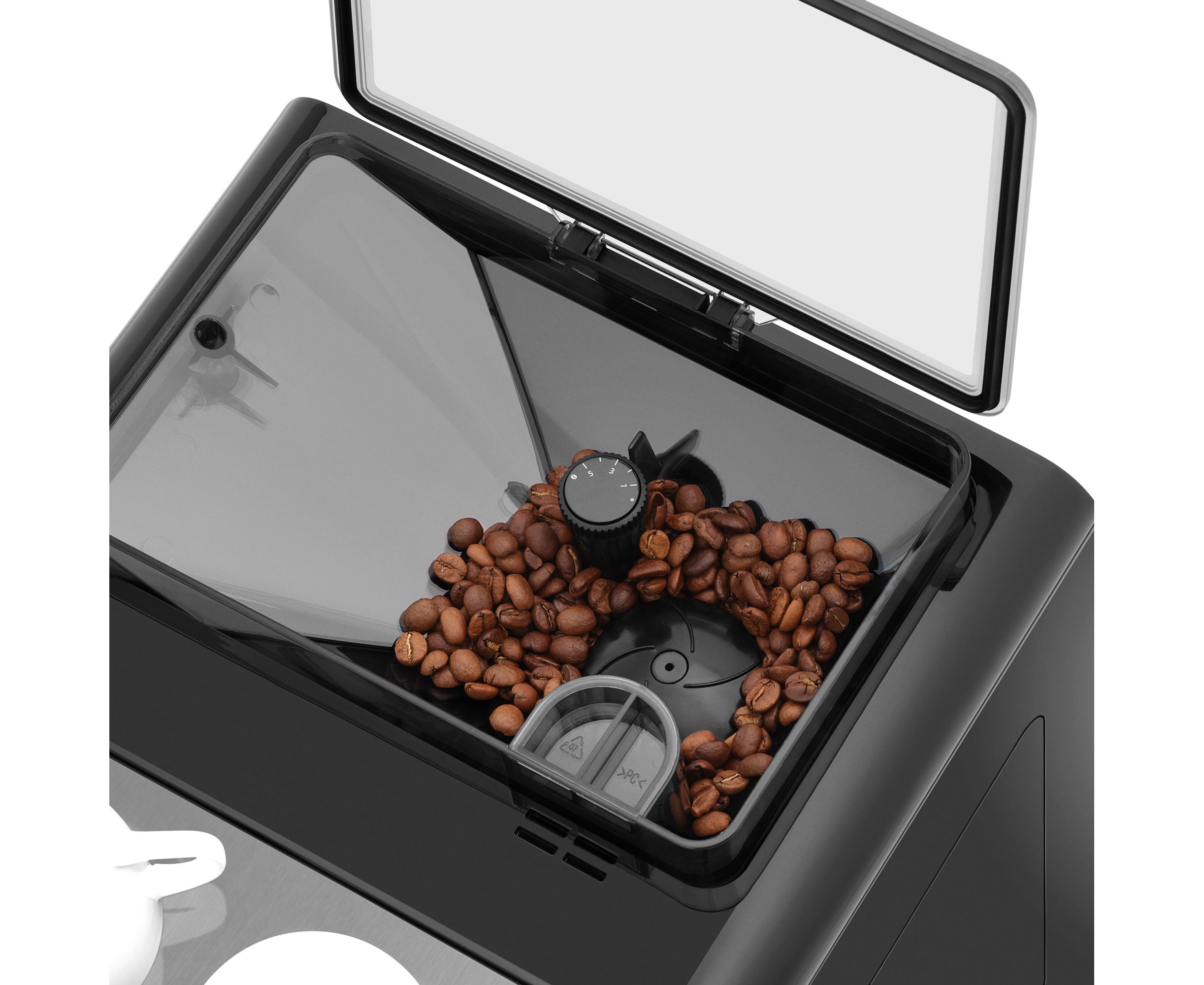В устройство также встроена профессиональная коническая кофемолка, предусматривающая 5 степеней помола. Она интегрирована с контейнером для зерен объемом 250 г. Помимо этого в устройстве предусмотрена возможность приготовления напитков из молотого кофе.