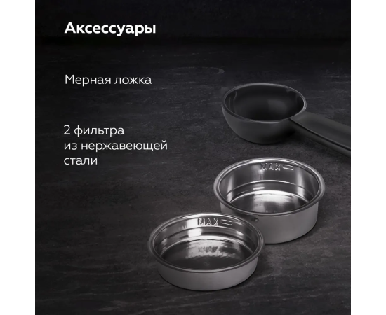 В комплектацию устройства входит 2 фильтра из нержавеющей стали (на 1 и 2 чашки кофе) и мерная ложка.