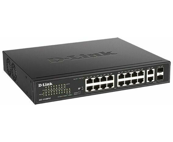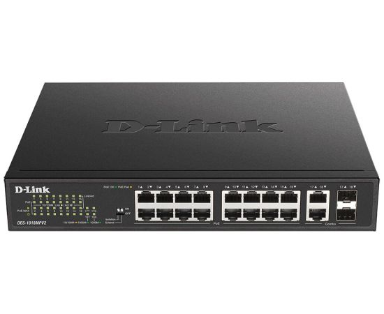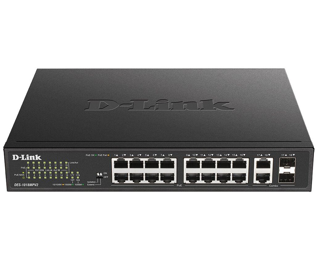 Неуправляемый коммутатор DES-1018MPV2, оснащенный 16 портами 10/100Base-TX с поддержкой PoE и 2 комбо-портами 100/1000Base-T/SFP, позволяет пользователям легко подключать и подавать питание по Ethernet-кабелям на PoE-совместимые устройства, например на сетевые камеры, и является оптимальным решением для развертывания систем видеонаблюдения.
