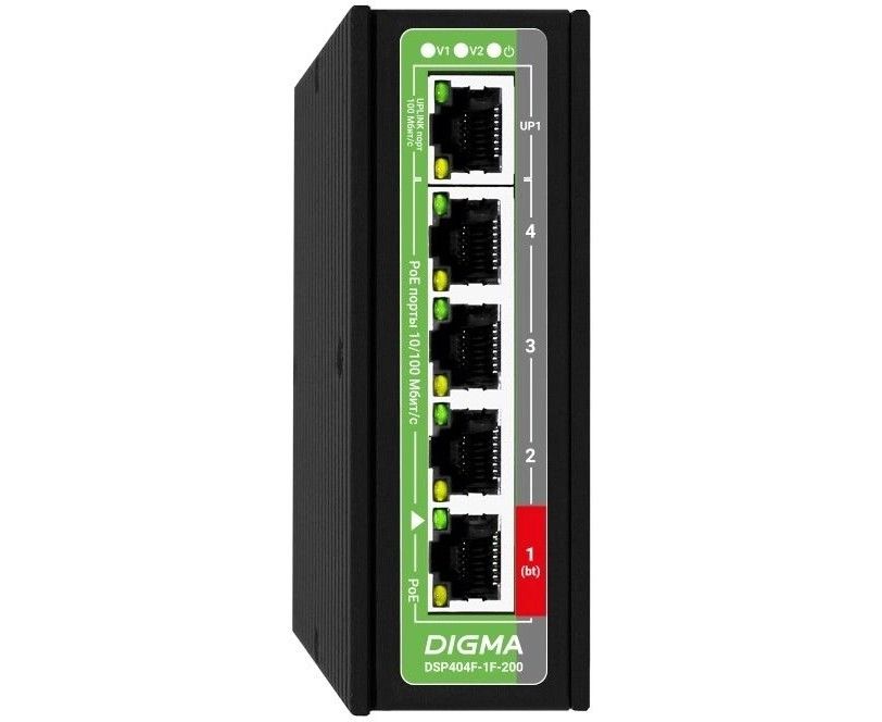 Коммутатор неуправляемый Digma DSP404F-1F-200 (L2) 5x100Мбит/с 4PoE 4PoE+ 1PoE++ 200W