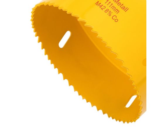 Конструкция оснащена специальным отверстием в боковой стенке, которое компенсирует деформации при перегреве, отводит строительную пыль и шлам. Особая заточка зубьев способствует эффективному входу в материал, что позволяет вырезать отверстия правильной круглой формы без сколов и трещин.