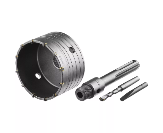 При прокладке коммуникаций в строящемся здании не обойтись без коронок по бетону. Они позволяют без труда получать отверстия среднего или большого диаметра в самых прочных материалах. Коронки имеют твердосплавные зубья из сплава ВК85, усовершенствованную систему крепления сверла на конус и резьбовое соединение с державкой М22.