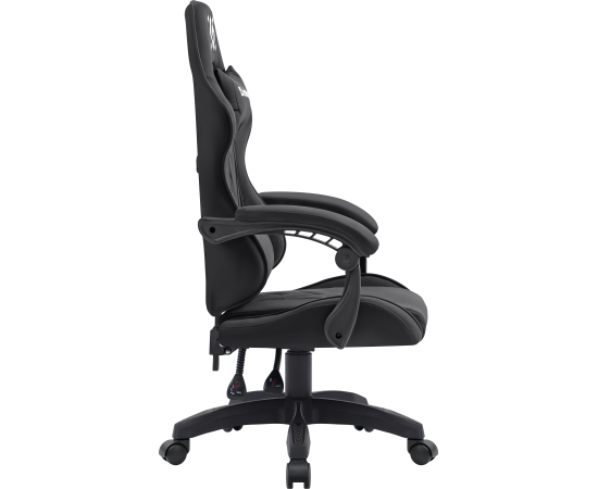 Стильное игровое кресло с мягкими подлокотниками и регулируемым наклоном спинки. В комплект входят шейная и поясничная подушки. Обивка выполнена из прочной мягкой ткани черного цвета.