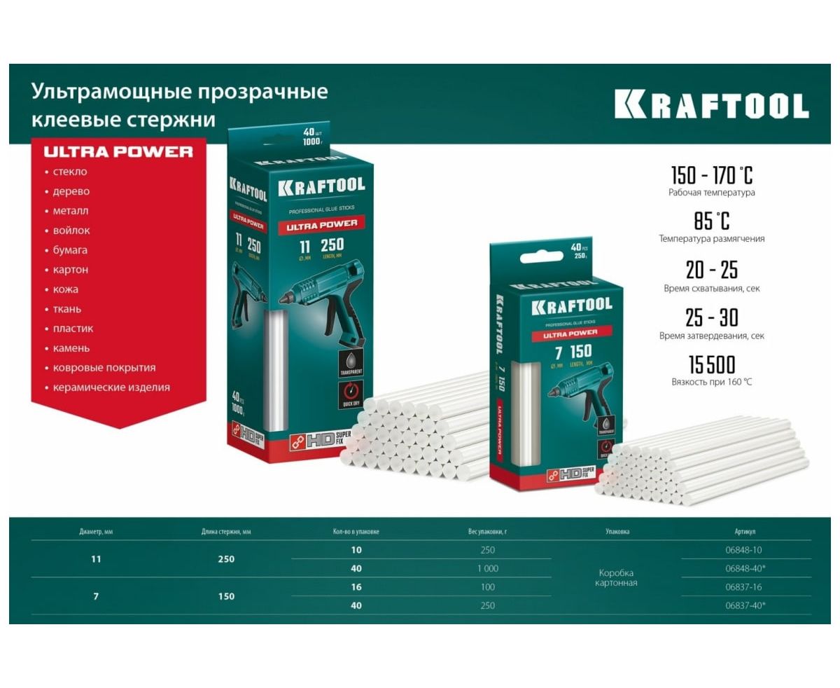 Кристально прозрачные клеевые стержни KRAFTOOL Crystal 40 шт, 11x250 мм 06846-40 - универсальные клеевые стержни со специальным составом обеспечивающим полную прозрачность клея после застывания.