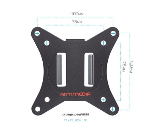 Имеет настольный тип установки с механизмом защиты от падения. Крепёжные отверстия настольного кронштейна ARM MEDIA LCD-T10 BLACK изготовлены по международному стандарту VESA.