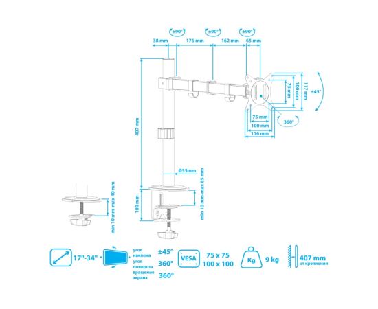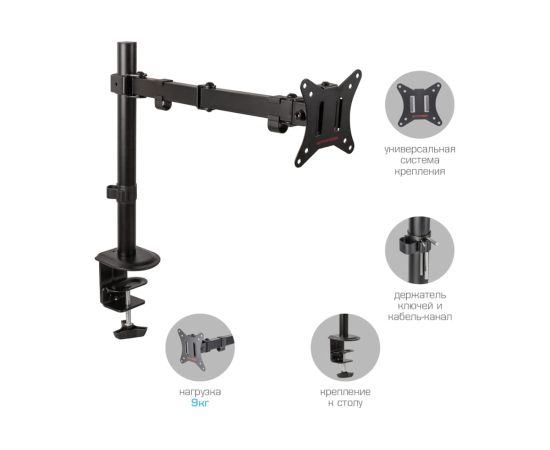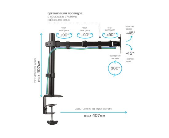 Настольный кронштейн для крепления телевизоров и мониторов надёжно удержит экран размером 15"-34" дюйма и весом до 9 кг. Наклонно-поворотная регулировка позволит вращать экран на 360°, наклонять вверх и вниз на ±45°, и поворачивать влево и вправо на 360° – для оптимального угла зрения и удобной посадки.
