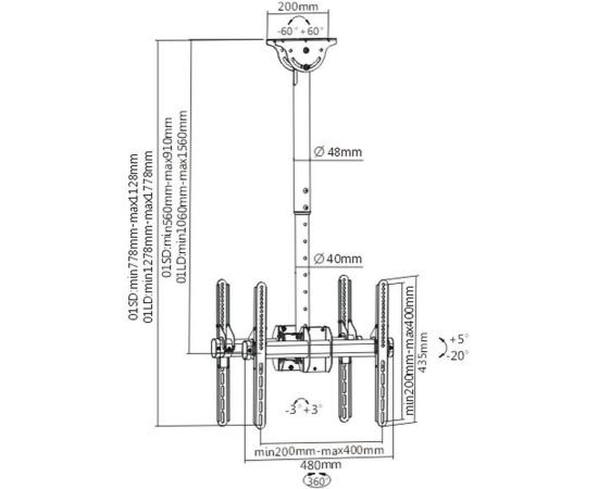 Описание Потолочный кронштейн для LCD/LED телевизоров размером от 26 до 65 дюймов с максимальным весом до 2×45 кг. с возможностью крепления на наклонный потолок. Надежная стальная конструкция. Регулировка наклона +5 -20 и углом поворота ±180 градусов. Максимальные крепежные размеры 400×400 мм.