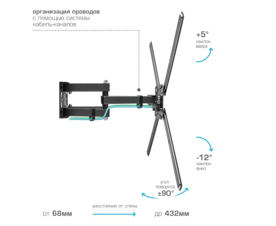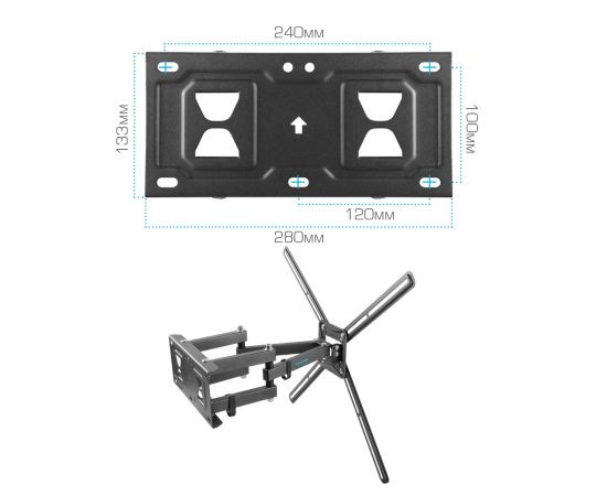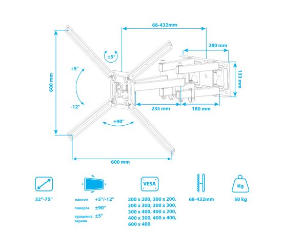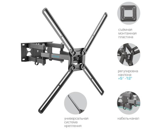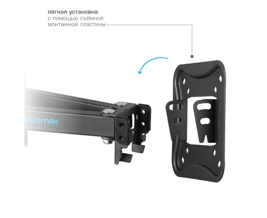 Надежная стальная конструкция максимальная нагрузка до 50 кг, Универсальная система крепления, Легкий монтаж при помощи съемной монтажной пластины, Вращение экрана уникальная возможность вращения экрана на ±5° относительно стены