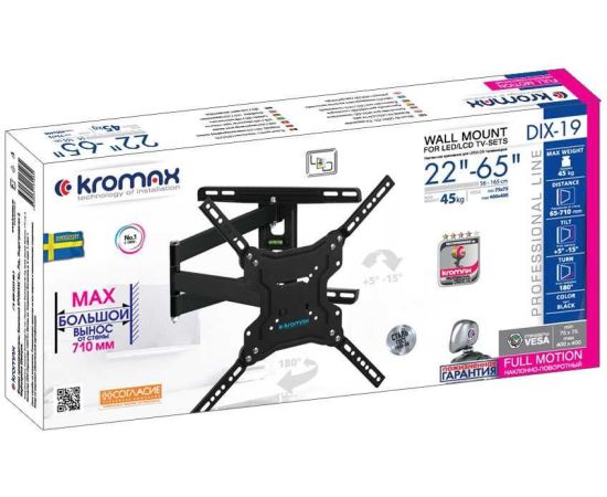 Кронштейн для телевизора Kromax DIX-19 черный 22"-65" до45кг поворотно-выдвижной и наклонный