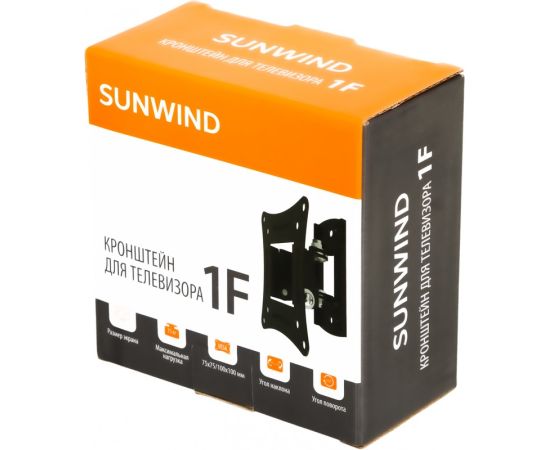 Кронштейн Sunwind 1F позволяет поворачивать и наклонять закрепленный на нем телевизор. Для цветовой гармонии настенное приспособление выкрашено в черный цвет, поскольку нынче большинство моделей телевизоров изготавливается с черными корпусами. Металлоконструкция поддерживает такие стандарты крепления VESA, как 75 х 75 и 100 х 100. Телевизор с массой до 15 кг и диагональю экрана в диапазоне 20-29 дюймов в процессе эксплуатации можно наклонять на угол -5/+15 градусов, а также поворачивать на угол -45/+45 градусов. Минимальная дистанция от стеновой либо потолочной поверхности – 58 мм. При поиске подходящего места для установки следует делать акцент на несущих способностях стены.