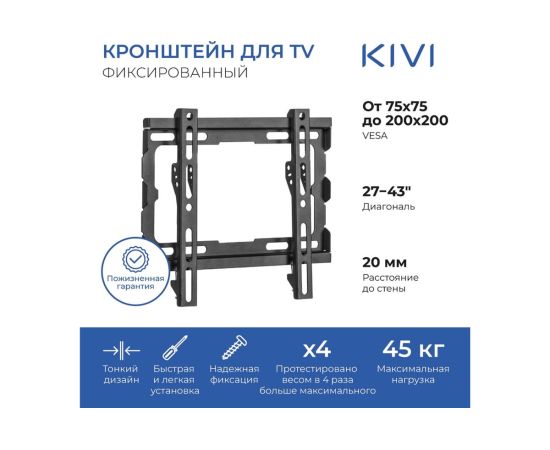 Кронштейн KIVI Basic-22F гарантирует вам не только безопасное крепление, но и стильный вид вашего телевизора. Прочные элементы крепления выдерживают интенсивное использование. Кронштейн подойдет для телевизоров с диагональю от 23 до 43 дюймов и весом до 45 килограммов.