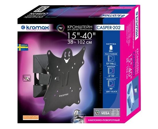 15"-42" Кронштейн Kromax CASPER-202 black ,max 30 кг, 3 ст св., нак. +5°-15°, пов. 90°, от ст. 57-110 мм, max VESA 200x200 мм.