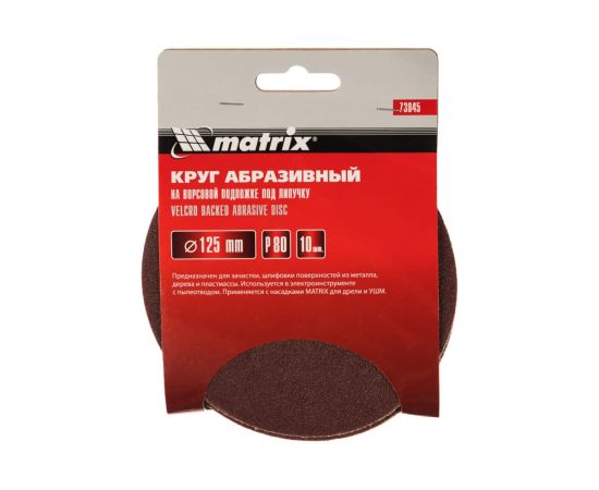 Абразивный круг на ворсовой подложке под «липучку» Matrix Р80 арт. 73845 используется для сухого первичного шлифования металла, дерева, пластика и других поверхностей. Круг устанавливается на эксцентриковые (орбитальные) шлифовальные машинки или на дрель с помощью опорной насадки Matrix.