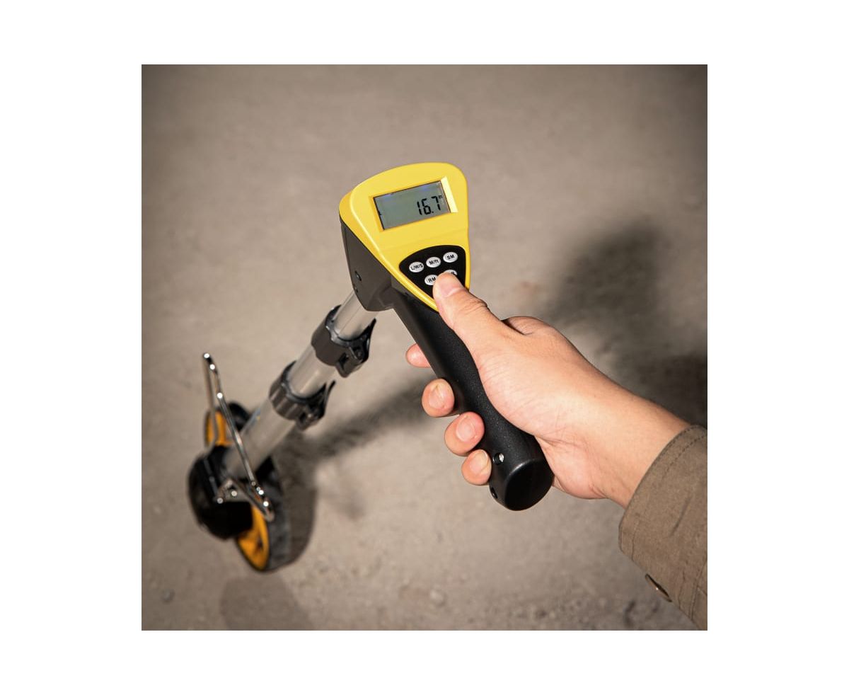 Измерительно колесо оснащено удобной подножкой для установки колеса в вертикальное положение.