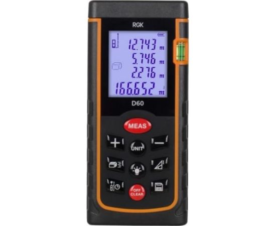 Лазерная рулетка RGK D60 служит для измерения расстояний до 60 метров. Она используется при ремонте и строительстве. Модель снабжена следующими функциями: сложение и вычитание, расчет площади, определение неизвестной высоты по Пифагору, непрерывное измерение, максимум/минимум, измерение заданной длины. Все измерения выводятся на четырехстрочный дисплей с подсветкой. Корпус прибора защищен от влаги и пыли по стандарту IP54.