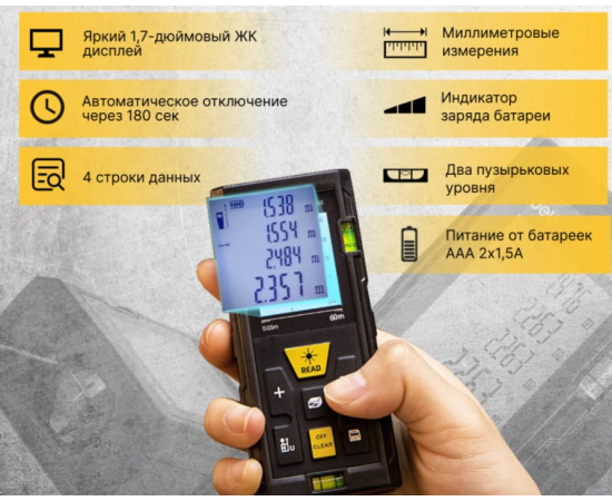 Дальномер оснащен лазером, который позволяет измерять расстояния на удалении до 60 метров с трехмиллиметровой точностью.
