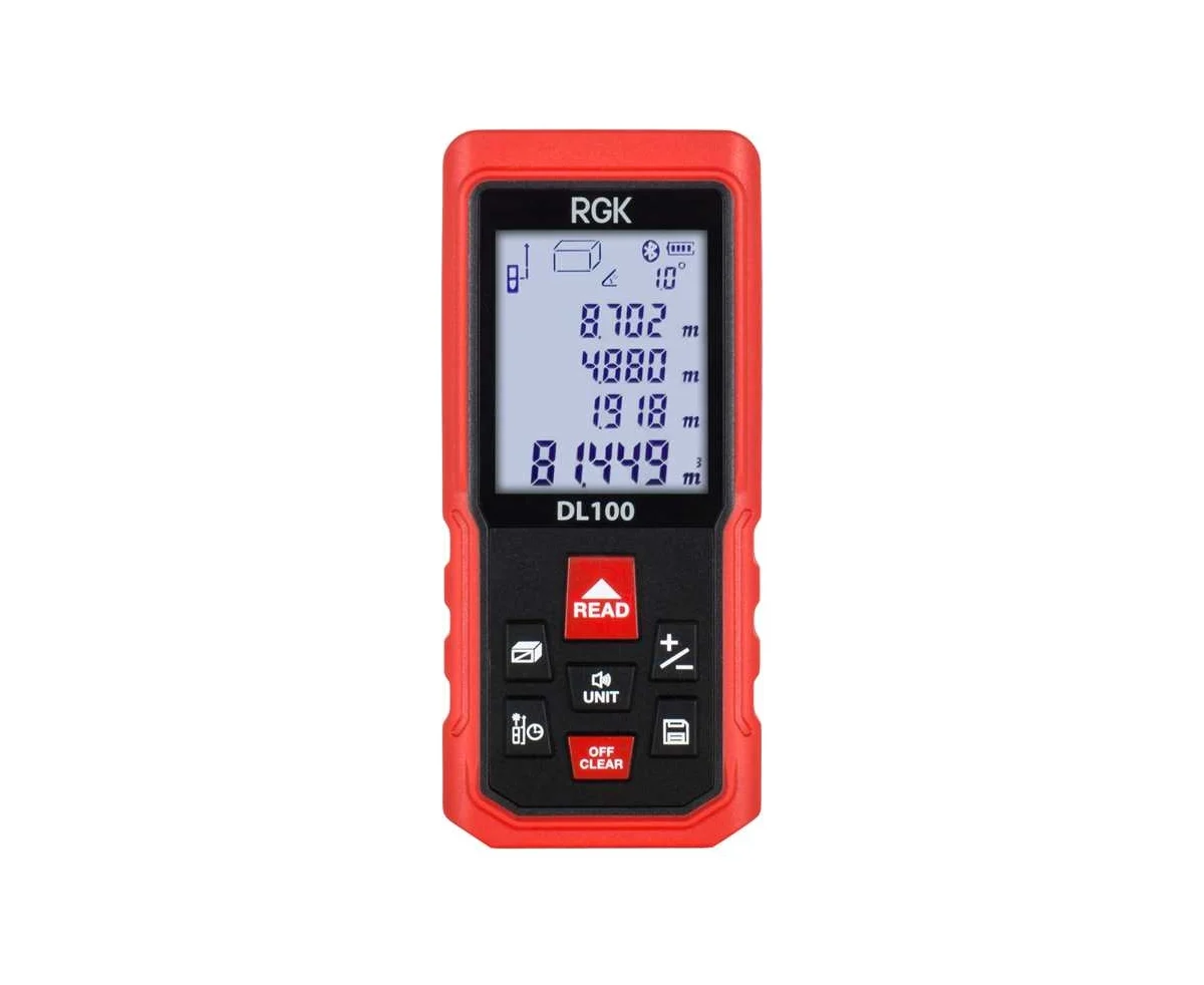 Технические характеристики RGK DL100 755719 Поверка да Внесен в госреестр да Класс лазера 2 Цвет луча красный Погрешность ±2 мм Встроенный прицел нет Bluetooth нет Ударопрочный корпус да Функция Пифагора да Функция сложения/вычитания да Вычисление углов да Функция расчета объема да Непрерывное измерение да Вычисление площади да Встроенная память да Подходит для использования на улице да Дальность измерения с/без отражателем 100 м