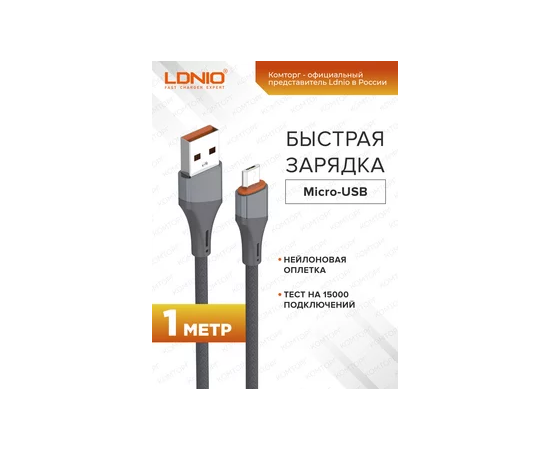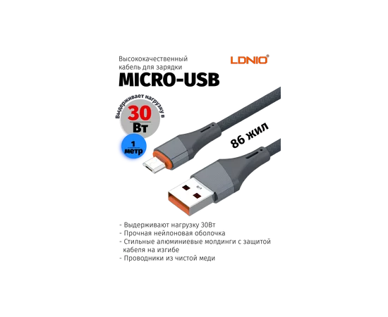 LDNIO LS631/ USB кабель Micro/ 1m/ 30W/ медь: 86 жил/ Нейлоновая оплетка/ Gray