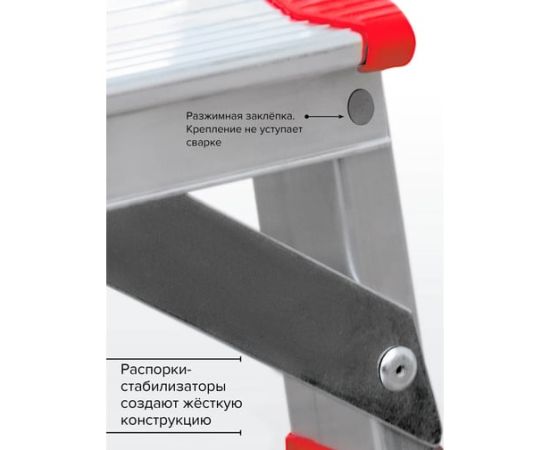 Рифлёная поверхность ступеней способствует безопасному подъёму и спуску. Прочное крепление ступеней к боковинам заклепками придаёт конструкции высокую устойчивость.