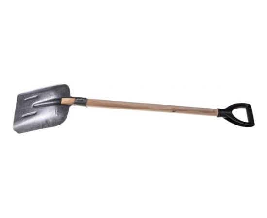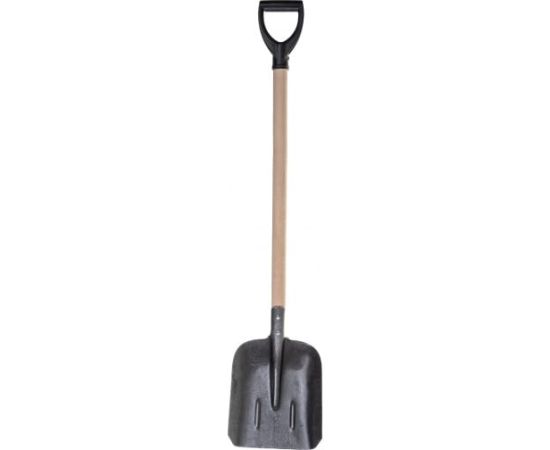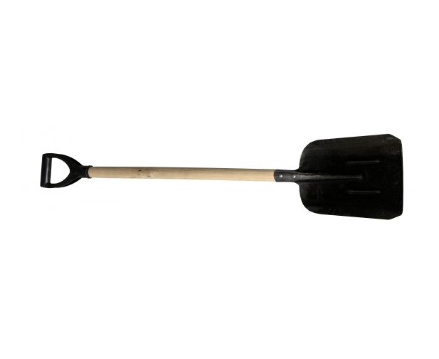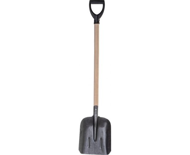 Деревянный черенок надежно закреплен, что позволяет работать с большими объемами грунта и сыпучих материалов