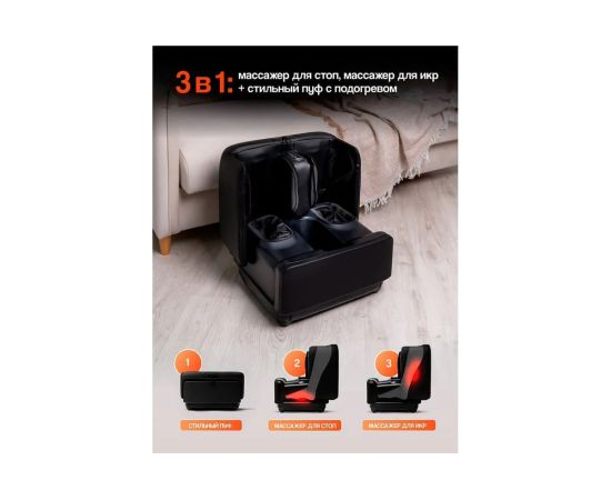 Массажер для ног GESS PUF черный GESS-101 black для стоп и икр для комплексного воздействия на ноги. Способствует снятию напряжения в мышцах, прорабатывает все важные акупукнтурные точки. Массажер для ног в сложенном виде имеет форму пуфика, он не будет выделяться, его можно хранить на видном месте и использовать как отдельный предмет интерьера. Объединяет в себе три важных функции: массаж стоп, лимфодренаж и удивительно удобное место для отдыха. Массажер для ног с несколькими видами массажного воздействия: роликовый, акупунктурный, воздушно-компрессионный и вибромассаж. Можно отдельно выбрать зоны массажа и настроить интенсивность воздействия. Массаж осуществляется воздушными подушками, акупунктурными аппликаторами и массажными роликами. У массажера PUF 5 автопрограмм, позволяющих выбрать именно тот вариант, который подходит в данный момент. Электрический массажер позволяет эффективно проработать стопы, глубоко промассировать икры, снять неприятные ощущения в ногах после длительного стояния или сидения. По желанию можно включить прогрев стоп или сидения (в сложенном виде). Это позволит сидеть на теплом пуфике, когда не используются массажные функции. Панель управления находится на корпусе прибора, что обеспечивает легкий доступ и настройку параметров массажа. Комплексное воздействие массажера способствует общему улучшению организма. Регулярные сеансы массажа способствуют улучшению сна, настроения и повышению общего тонуса. Подходит до 45 размера стоп.