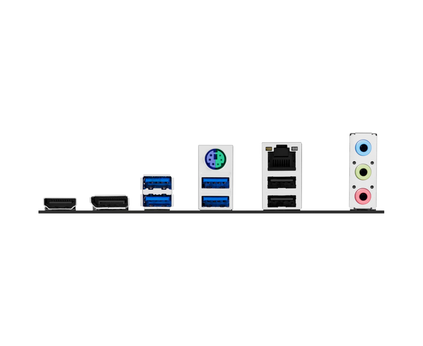PS/2, 2 x USB 2.0, 4 x USB 3.2 Gen1, HDMI, DisplayPort, RJ-45