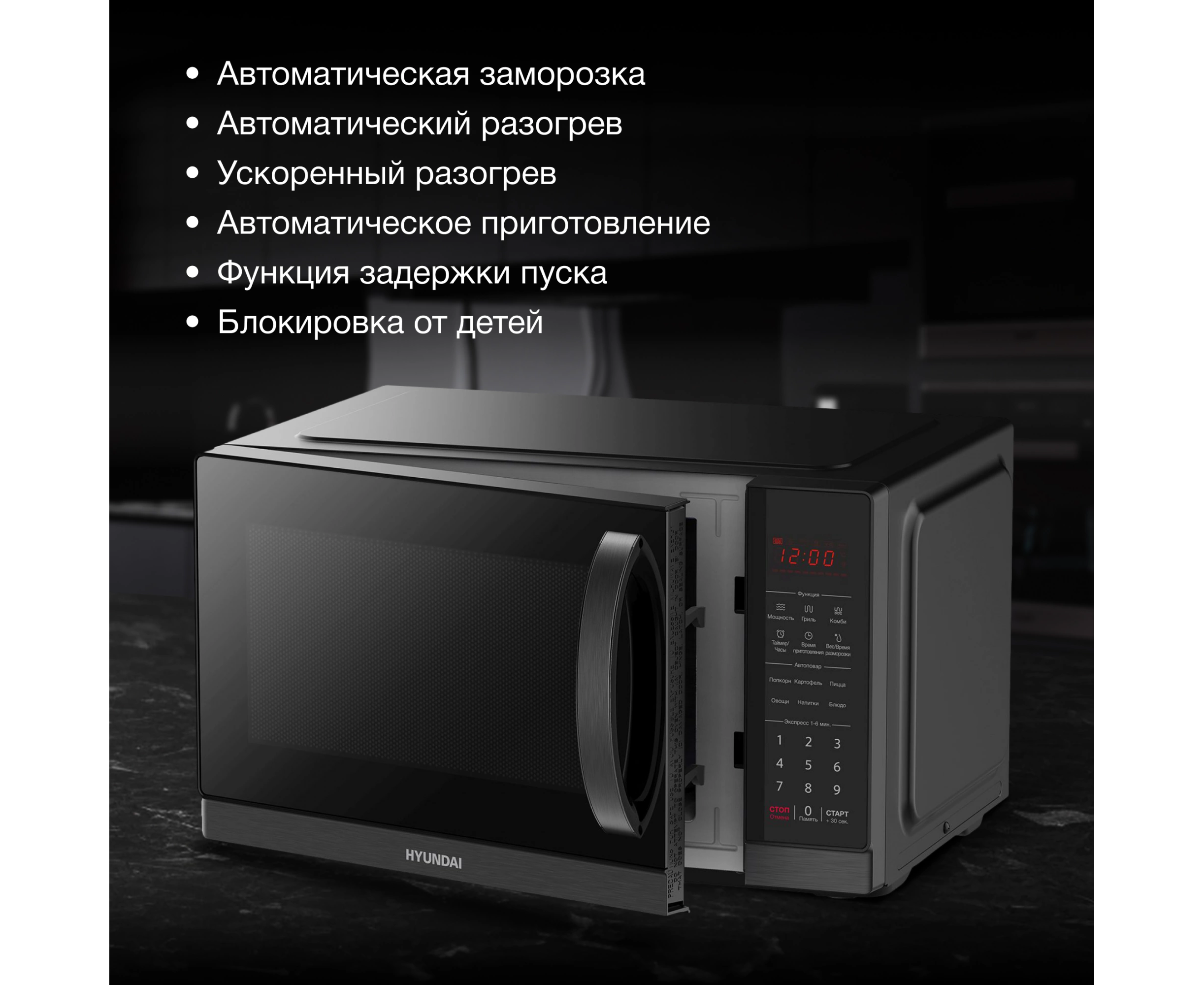 автоматическая разморозка, автоматическое приготовление, звуковой сигнал отключения
