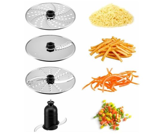 С установленными лезвиями комбайн работает как измельчитель. Он измельчает твёрдый сыр, травы, орехи. В комплекте также идут 3 диска: насадка с крупной тёркой/шинковка, насадка с мелкой тёркой и насадка для картофеля фри.