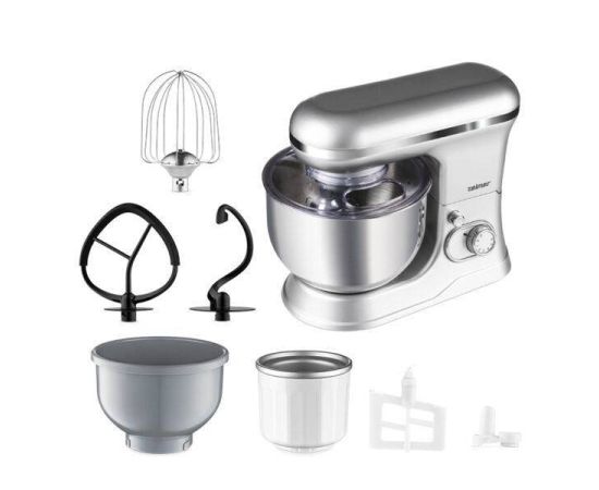 Планетарный миксер Zelmer ZKR1360, крышка для защиты от брызг, насадка-сбивалка, насадка-мешалка, крюк для замеса теста, пластиковая чаша 4,5 л, чаша из нержавеющей стали 5 л, набор для мороженого