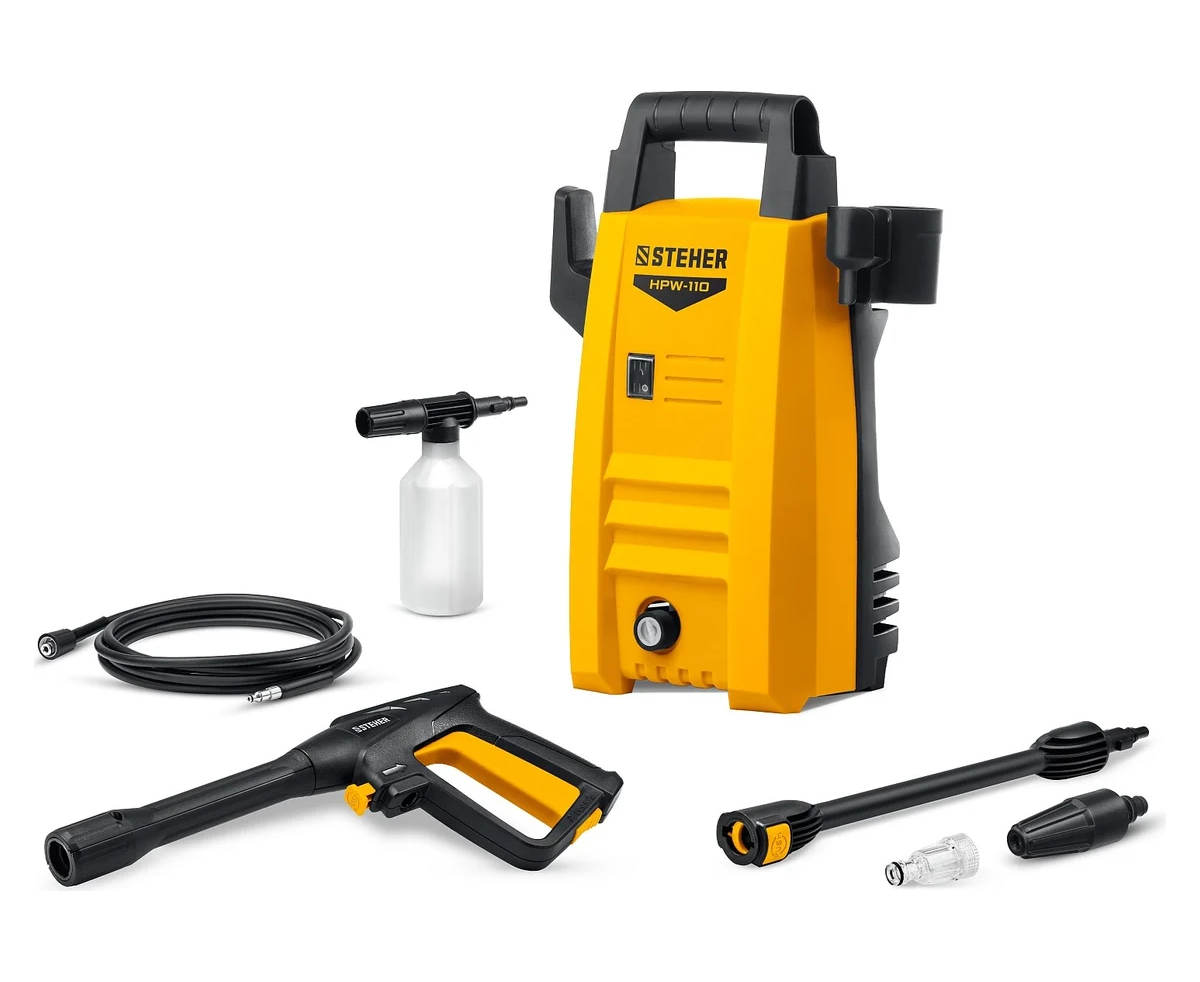 Мойка высокого давления STEHER HPW-110 предназначена для образования струи воды высокого давления, используемой для мойки автомобилей, велосипедов и другой колесной техники, садового инвентаря, наружных стен и уличных покрытий.