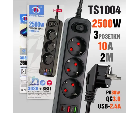 Многофункциональный сетевой фильтр Novartis Tyson TS1004 3 розетки + PD + QC3.0 + 1USB порт 2000mm Black