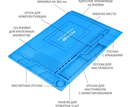 Монтажный коврик 02816 МЕГЕОН к0000026356 предназначен для предотвращения повреждения электро и радиоизделий статическим электричеством. Продуманная конструкция со множеством пронумерованных лотков позволит разместить большое количество компонентов. Дополнительно в поверхность были установлены 4 магнита для надёжной фиксации металлосодержащий элементов и комплектующих. Дополнительно имеются 3 лотка с крышками. В качестве материала был использован термостойкий силикон. Изделие одинаково может использоваться в профессиональной, научной и любительской областях.
