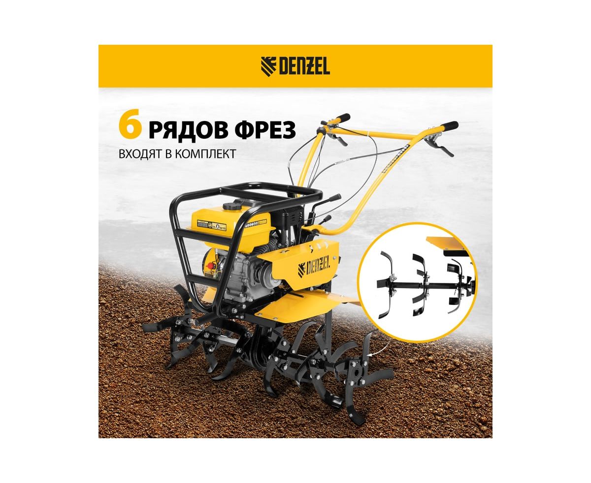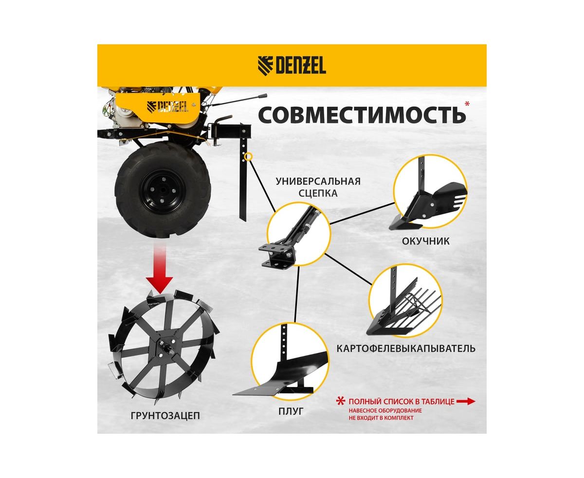 Мотоблок совместим со всеми моделями навесного оборудования, представленными в ассортименте Denzel (приобретаются отдельно).