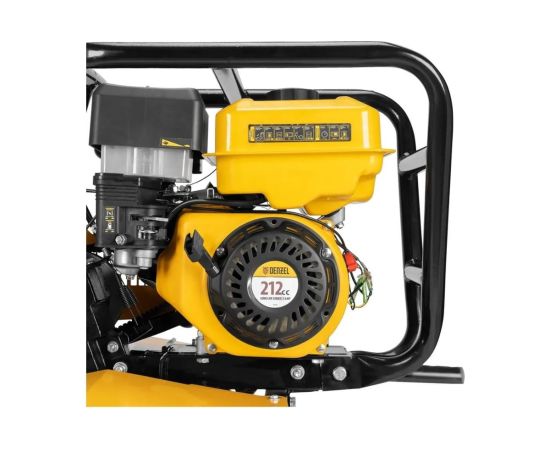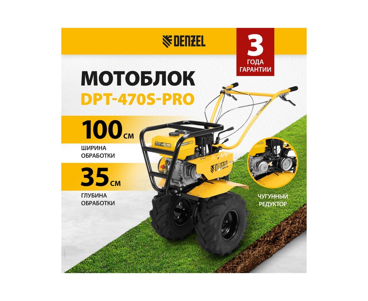 Мотоблок Denzel DPT-470S-PRO 56445 с ременным сцеплением, двигателем объемом 212 см3 и мощностью 7 л.с., с коробкой передач 4 вперед/2 назад и шкивом отбора мощности, комплектуется 24 фрезами (3х4). Предназначен для выполнения земляных работ: прополки, вспахивания, боронования грунта, перевозки грузов и т.д.